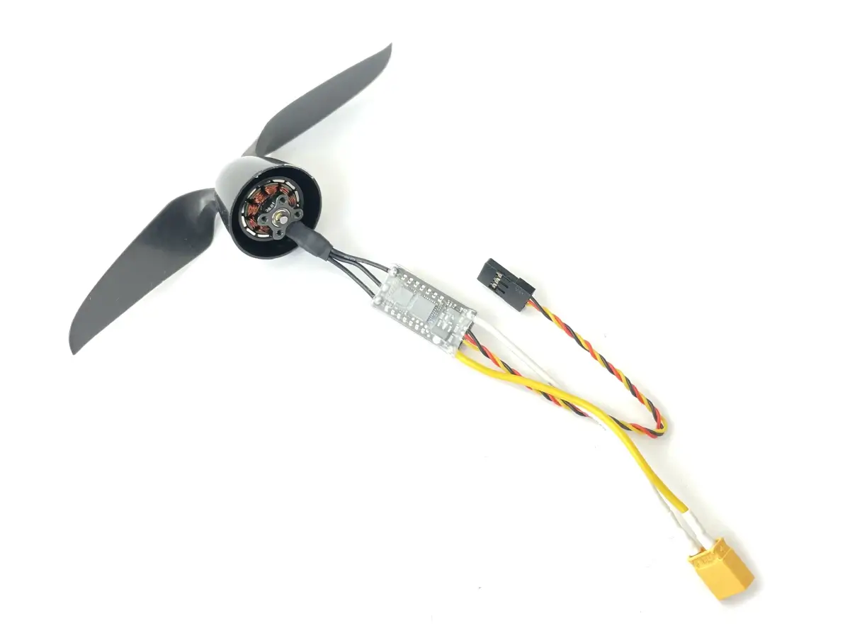 Feeding from a 2S LiPo battery, it provides enough power for your onboard micro RC receiver and servos, and up to 230g of thrust.